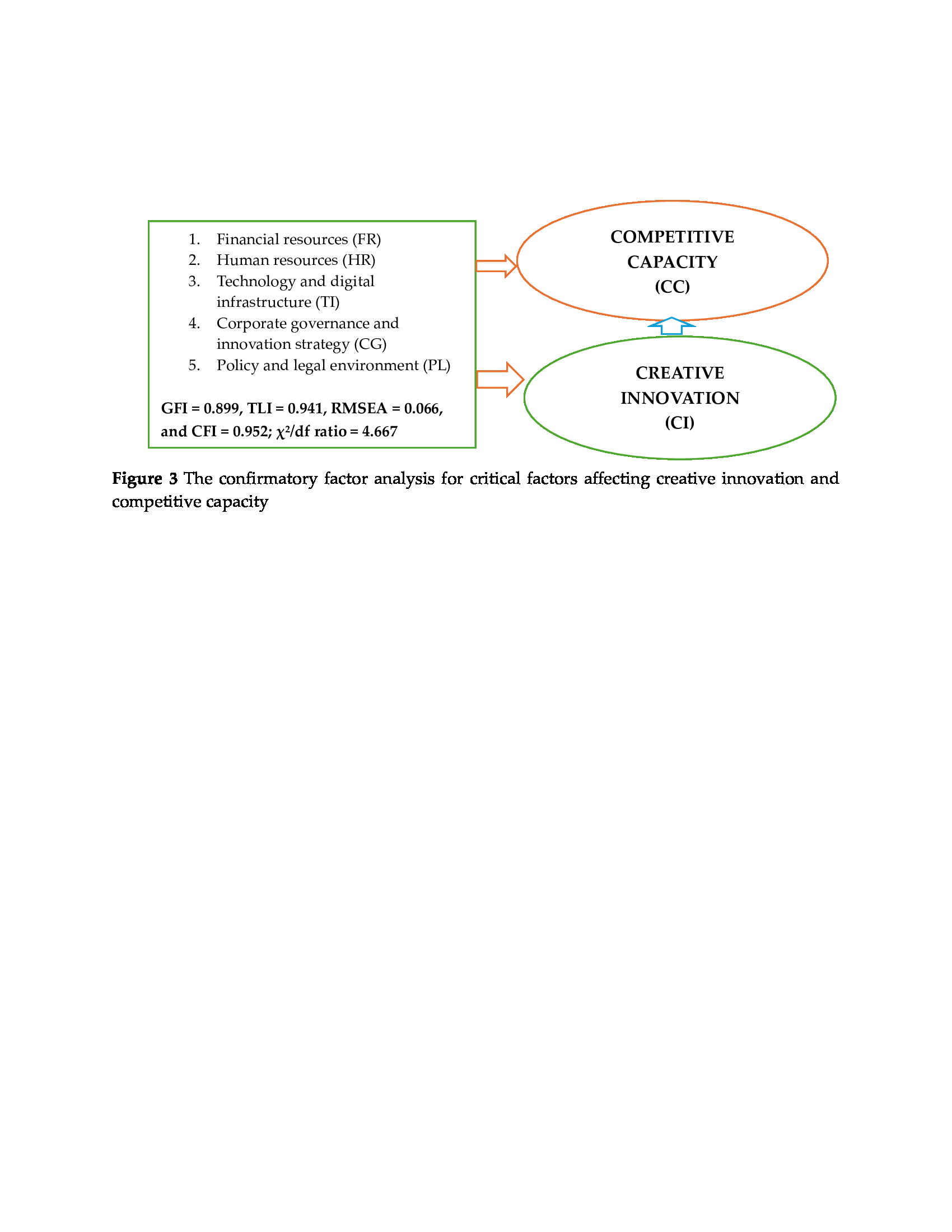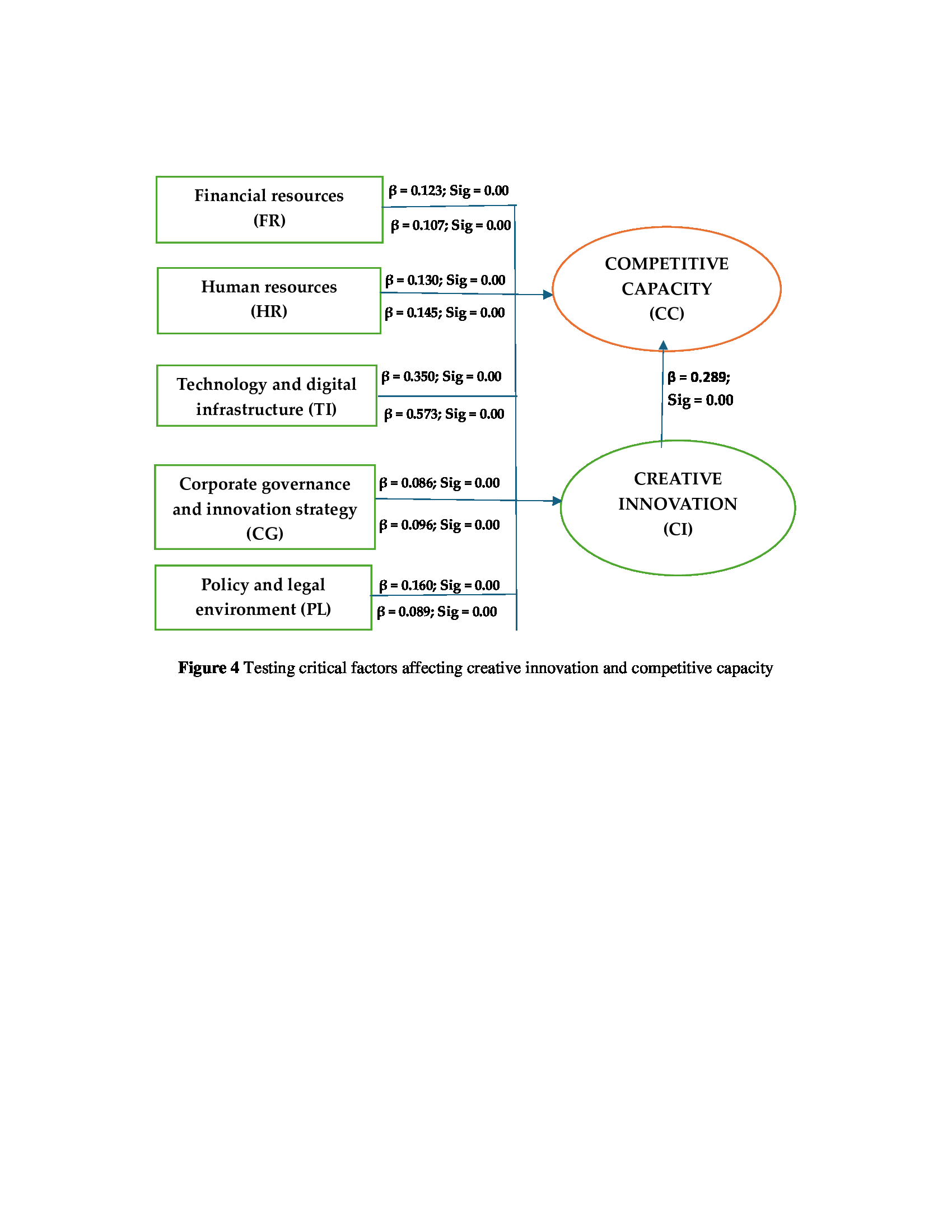 Innovation is increasingly becoming a breakthrough and indispensable driving force in science and technology development, particularly in the country’s development strategy, and is the key to improving competitiveness and businesses’ rapid and sustainable development. Therefore, this study aimed to determine the impact of digital technology on creative innovation among small-scale enterprises in Vietnam. On this basis, the authors proposed policy implications that enhance creative innovation and competitive capacity. Qualitative methods were used to collect data and consult with 30 managers at 30 enterprises. The quantitative method was also applied by collecting survey data from 900 managers working for 900 small and medium enterprises in six large cities in Vietnam. Data were collected using an online questionnaire (docs.google.com) and processed using SPSS 20.0 software; Amos was based on the structural equation model. Research results show five factors affecting the creative innovation and competitive capacity of small and medium enterprises (SMEs) in Vietnam with a significance level of five percent: (1) financial resources (FR), (2) human resources (HR), (3) technology and digital infrastructure (TI), (4) corporate governance and innovation strategy (CG), and (5) policy and legal environment (PL). The authors also provided five policy recommendations for improving creative innovation and competitive capacity. Finally, the study concludes that innovation positively impacts the competitiveness of SME. Furthermore, the authors also point out that the relationship between innovation and technology and digital infrastructure is positive. The novelty of the research provides important policy implications for promoting innovation and improving competitiveness, focusing on improving technology and digital infrastructure.